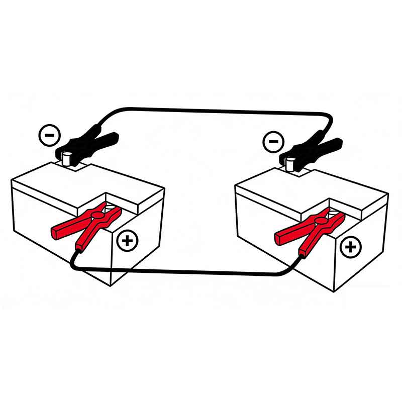• ఇతర రెడ్ క్లాంప్ను బిగించండిపాజిటివ్ (+) టెర్మినల్పూర్తిగా పనిచేసే బ్యాటరీ.