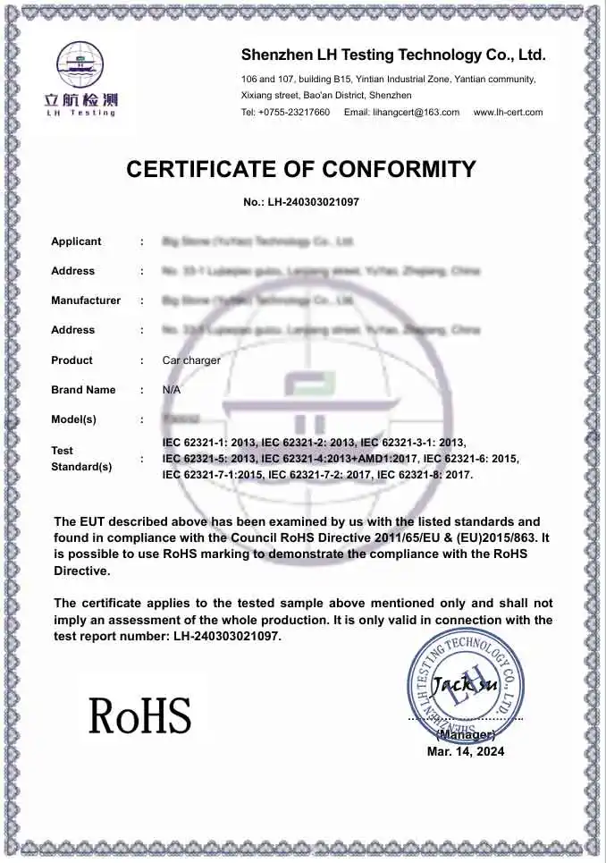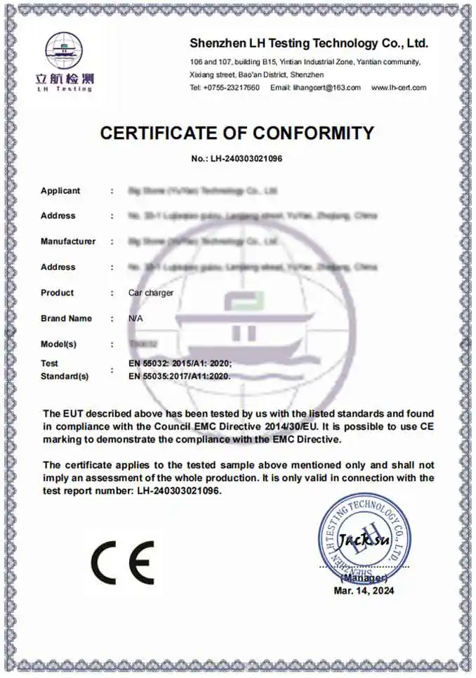 జ: ప్రొఫెషనల్ ఫ్యాక్టరీగా, మా ఉత్పత్తులు అంతర్జాతీయ భద్రత మరియు పర్యావరణ ప్రమాణాలకు పూర్తిగా అనుగుణంగా ఉంటాయి. మేము CE మరియు RoHS ధృవీకరించబడిన ఉత్పత్తులను అందిస్తాము. ఇంకా, మా ఉత్పత్తి సదుపాయం BSCI మరియు ISO సర్టిఫికేట్ పొందింది, మా కార్ ఛార్జర్ అడాప్టర్లు ప్రీమియం గ్లోబల్ బ్రాండ్లకు అవసరమైన కఠినమైన సాంకేతిక మరియు నైతిక ప్రమాణాలకు అనుగుణంగా ఉన్నాయని నిర్ధారిస్తుంది.