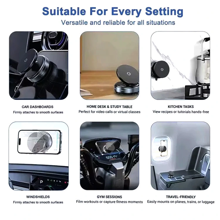 సౌకర్యవంతమైన ఉపయోగం: ఈ కార్ ఫోన్ మౌంట్ ఇన్స్టాల్ చేయడం సులభం మరియు సురక్షితం. ఏదైనా మృదువైన ఉపరితలంపై గట్టిగా లాక్ చేయడానికి ఆధారాన్ని ఎడమవైపుకు తిప్పండి. దాన్ని తీసివేయడానికి లేదా పునఃస్థాపించడానికి విడుదల చేయడానికి ఆధారాన్ని కుడివైపుకు తిప్పండి. 360° తిరిగే బాల్ జాయింట్ మీ ఫోన్ని గరిష్ట సౌలభ్యం కోసం ఏదైనా వీక్షణ కోణంలో సర్దుబాటు చేయడానికి మిమ్మల్ని అనుమతిస్తుంది.